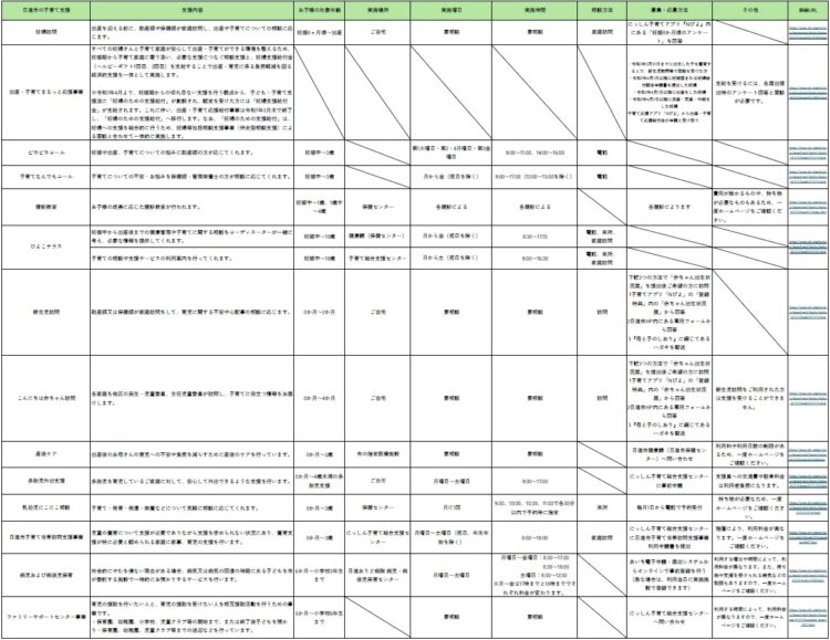 それぞれの支援、支援を行う場所によって対象年齢や条件がございますので、詳細は表の一番右にあるURLからご確認いただけましたら幸いです。