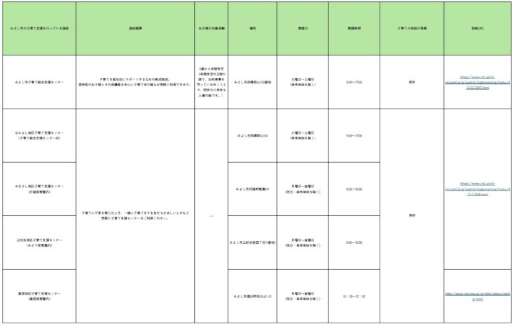 みよし市では、下記一覧表に記載をした子育て支援が行われております。