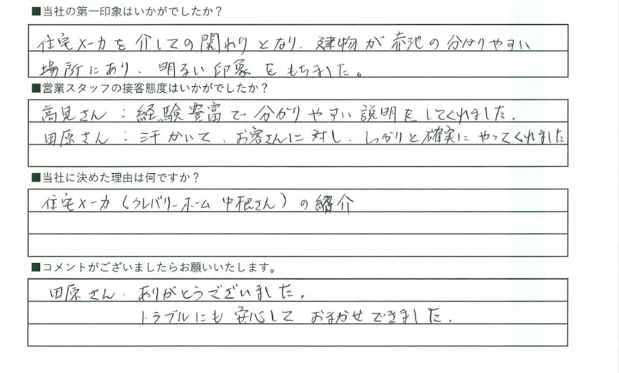 住宅メーカーを介しての関わりとなり、建物が赤池の分かりやすい場所にあり、明るい印象をもちました。