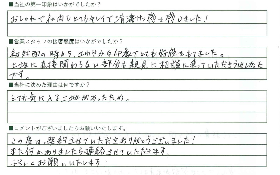 初対面の時から、さわやかな印象でとても好感をもてました。土地に直接関わらない部分も親身に相談に乗っていただきうれしかったです。