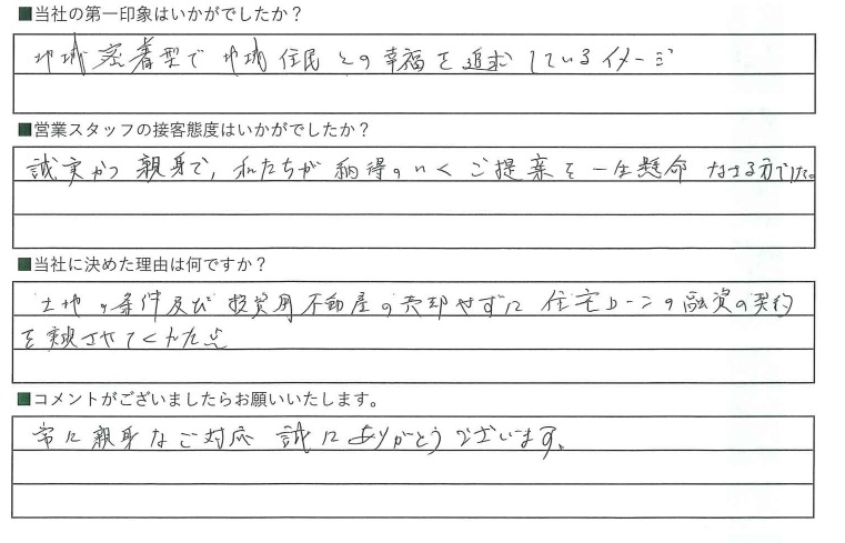 誠実かつ親身で、私たちが納得のいくご提案を一生懸命なさる方でした。
