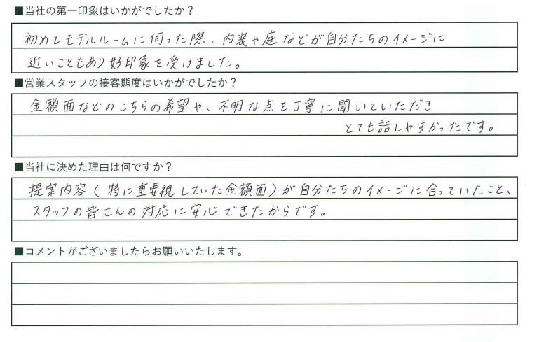 初めてモデルルームに伺った際、内装や庭などが自分たちのイメージに近いこともあり好印象を受けました。